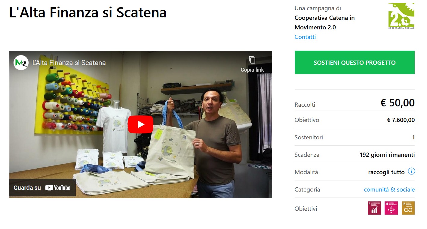 È partita ufficialmente la raccolta fondi per supportare “L’Alta Finanza si Scatena”, il progetto realizzato in collaborazione con Catena in Movimento con l’obiettivo di favorire il reinserimento sociale delle persone in difficoltà socio economica attraverso la creazione di spazi di lavoro pensati per l’inclusione, l’integrazione, l’uguaglianza e la resilienza delle persone.
