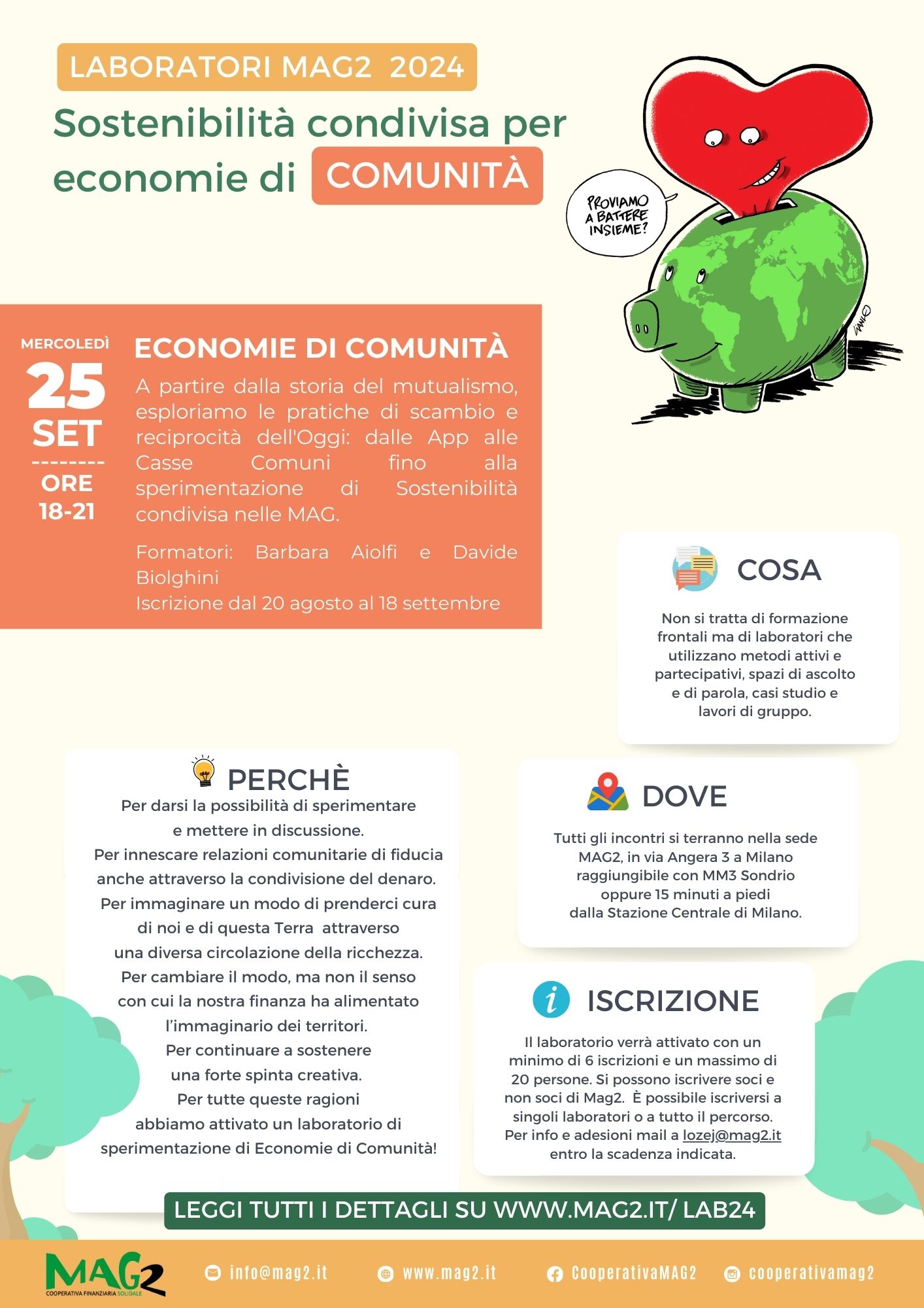 Sabato 28 settembre 2024 alle ore 18, nell’ambito del ricco programma della Green Week 2024 di Milano, gli Orti di via Isocrate – Villa Finzi in zona Gorla ospitano per la seconda volta la Cooperativa di finanza etica e solidale MAG2 Finance per un incontro con la cittadinanza. In questa edizione, saranno presenti alcuni dei referenti della nascitura CERS di Castello Cabiaglio (CR) per raccontarci la loro esperienza, assieme a Davide Biolghini (consigliere di MAG2 e di CO-energia), che sulle CERS (Comunità di Energia Rinnovabile Solidali) darà un inquadramento storico e normativo, ma anche etico e valoriale.