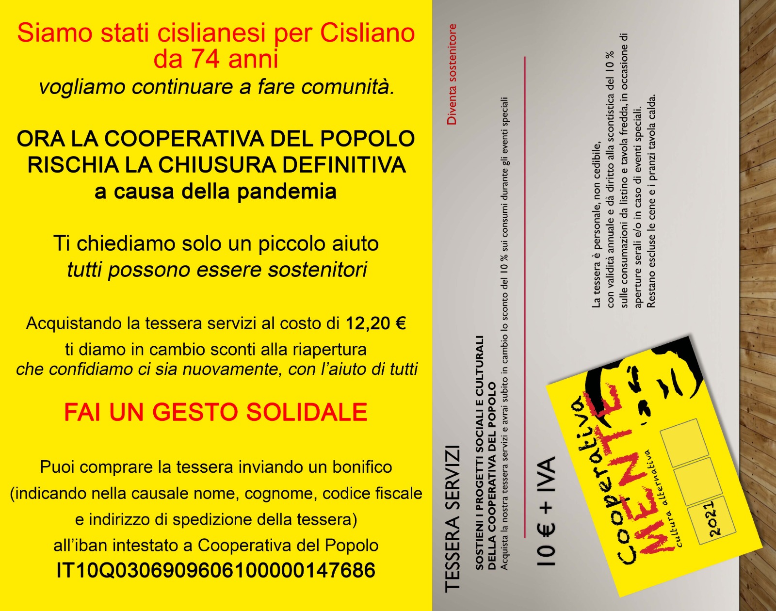 La Cooperativa del Popolo di Cisliano non molla e, nonostante la sospensione prolungata delle proprie attività causata dalla pandemia, chiede il nostro sostegno. Possiamo dare il nostro contributo aderendo alla campagna di tesseramento, ma anche acquistando regali natalizi scegliendo tra i loro prodotti e facendo l'ordine entro il 18 dicembre.