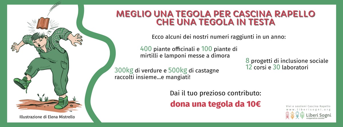 L’obiettivo nobile che per essere realizzato richiede la ristrutturazione completa di Cascina Rapello per renderla abitabile e accogliente e migliorare l'esperienza offerta dalle molteplici attività che già avvengono nello spazio intorno alla Cascina: cura dell’orto sociale ricco di verdura fresca e genuina, attività educative di esplorazione nei boschi di Castagno, sulle balze o di contatto con il mondo animale grazie alle quattro asinelle ospitate.