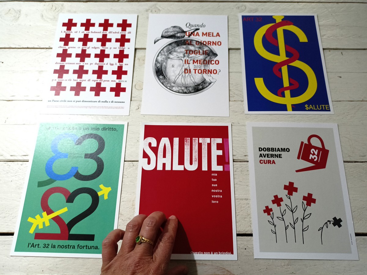 Un’esposizione composta da 40 poster firmati da 43 graphic designer per ribadire l’importanza dei contenuti dell’articolo 32 della Costituzione italiana: “La Repubblica tutela la salute come fondamentale diritto dell'individuo e interesse della collettività, e garantisce cure gratuite agli indigenti”. Il lavoro creativo è alla base della raccolta fondi attuale, mirata a creare 500 mini kit con le riproduzioni dei poster in formato A5 per semplificarne il trasporto e l’allestimento in spazi più piccoli, come nelle aule scolastiche, ma pure per poter essere utilizzati come gioco di carte. Di fatto una versione “portatile”, di facile e rapida diffusione, utile come strumento didattico e formativo, per riflettere sui vari aspetti legati al macro-tema Salute: il proprio corpo, la mercificazione della Sanità, il concetto di comunità, la cura, i propri diritti costituzionali, la pandemia, la salute dell’ambiente in relazione alla nostra e molto altro. Gli obiettivi dell’iniziativa per la quale si richiede il sostegno economico per stampare e distribuire le copie rimangono gli stessi della mostra: attrarre l’attenzione della cittadinanza sulla rilevanza della medicina territoriale, della prevenzione e della sanità pubblica efficiente per garantire il benessere psico-fisico a tutti.
