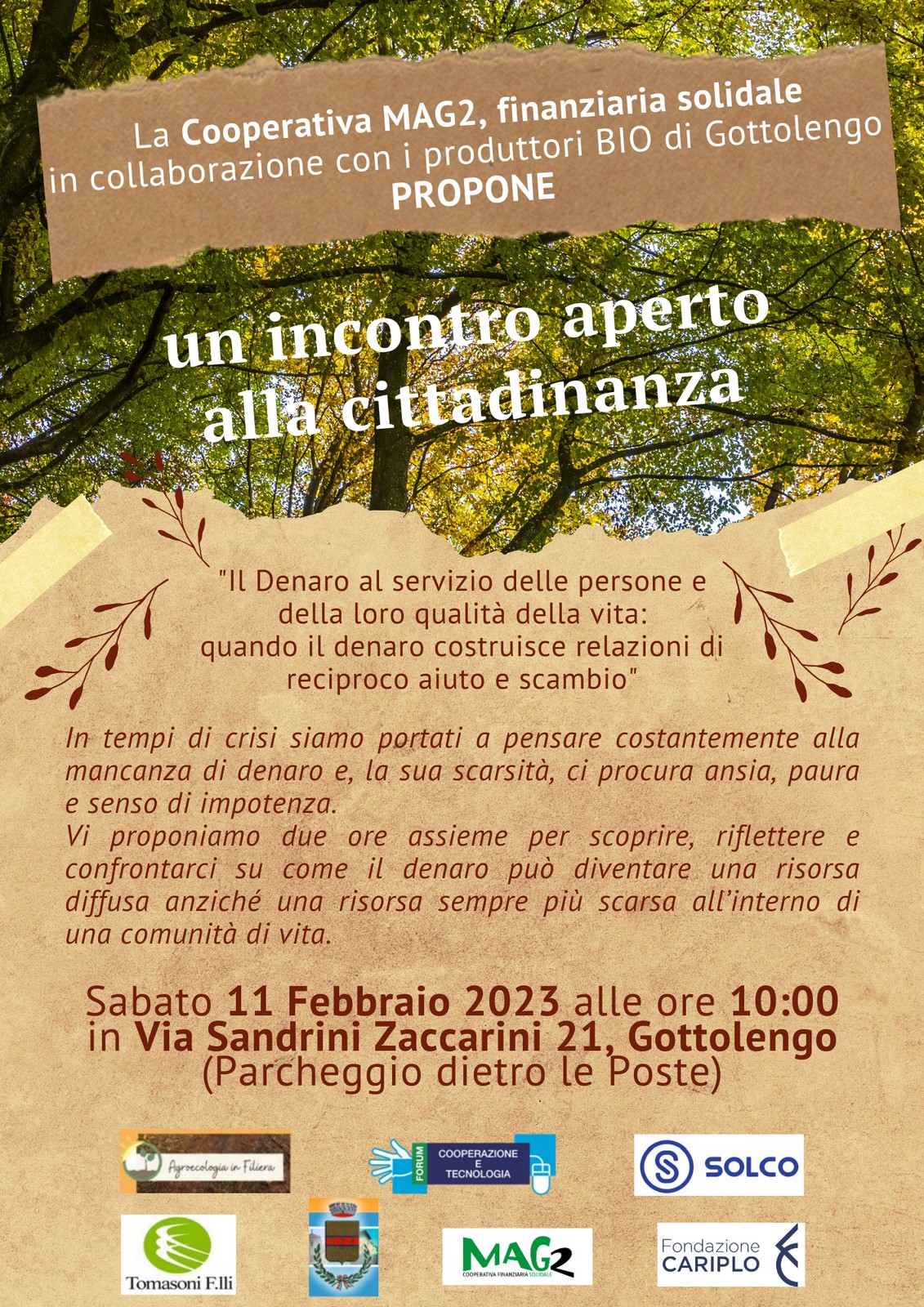 “Il denaro al servizio delle persone e della loro qualità della vita: quando il denaro costruisce relazioni di reciproco aiuto e scambio”. Questo il titolo dell’incontro tenuto dalla consigliera della nostra Cooperativa Monica Cellini, sabato 11 febbraio 2023 a Gottolengo (BS) e organizzato in collaborazione con i produttori della filiera corta protagonista del progetto Agroecologia in filiera: i soci di MAG2, Biocaseificio Tomasoni e Apicoltura Torretta Del Dosso di Riccardo Sudati, con capifila l’organizzazione Forum Cooperazione e Tecnologia. Un appuntamento aperto alla cittadinanza pensato per confrontarsi e riflettere insieme su come il denaro possa diventare una risorsa all’interno di un gruppo anziché una fonte di ansia da gestire in maniera individuale. Un ragionare particolarmente prezioso in tempi di crisi come gli attuali, durante i quali siamo portati a pensare costantemente alla mancanza di denaro con paura e senso di impotenza. Due ore intense ed interattive per condividere nuove visioni volte al benessere sociale, psicologico ed economico delle persone e delle comunità di cui sono parte.