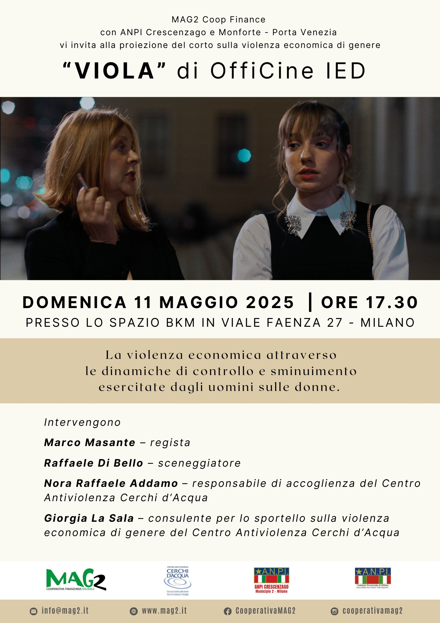 Sarà Viola la protagonista dell’ormai consueto approfondimento previsto nel giorno dell’Assemblea di Socie e Soci di MAG2, in programma l’11 maggio presso BKM a Milano. Viola è la protagonista dell’omonimo cortometraggio sulla violenza economica di genere. Un tema al centro dell’attività di sensibilizzazione della nostra cooperativa, iniziata con la promozione e la lettura del saggio “Il coraggio di contare” di Natascha Lusenti a novembre presso Arci Traverso e proseguita con l’organizzazione con Banca Etica di “Finanza di frontiera a servizio delle donne”, incontro tenutosi il 14 marzo a Fa’ la Cosa Giusta a Milano.