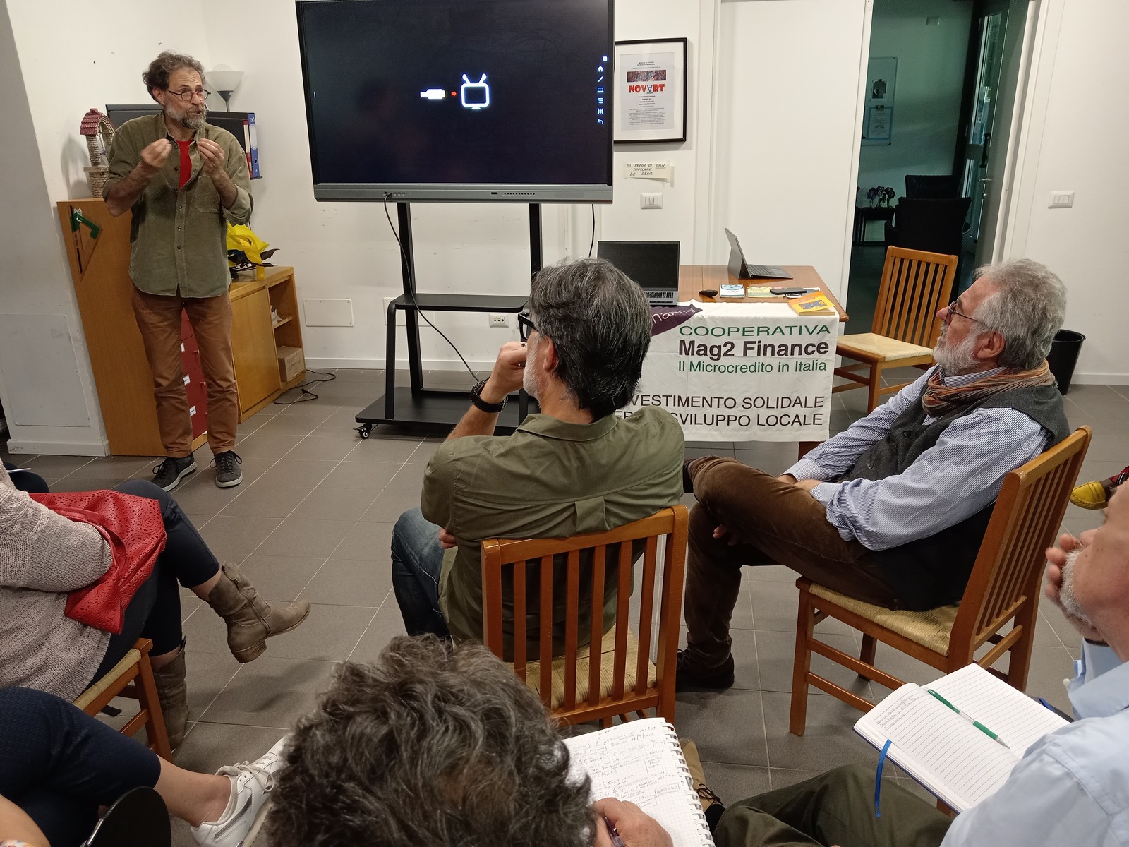 Il primo a intervenire è Giuseppe Lombardo, rappresentante di “Energia Solidale”, la realtà nata a seguito del progetto della costituente della CERS (Comunità energetica rinnovabile e solidale) di Castello Cabiaglio (VA) che coinvolge attivamente anche MAG2. Una narrazione proficua per capire l’attivismo del borgo collinare e le ripercussioni positive per l’intera comunità derivanti dal progetto in corso. Altra voce è stata quella di Davide Florit, uno dei relatori del terzo laboratorio (il secondo è il 24 maggio e le info sono qui) del percorso formativo di Sostenibilità Condivisa per Economie di Comunità. Un incontro intitolato “Coltiva-mente: autoproduci il tuo cibo” che, come ha spiegato Florit, si terrà il 14 giugno ad Allegricola e rientrerà in una serie di iniziative sul cibo che verranno svelate lo stesso giorno. Molto gradita è stata pure la presenza di Alessandra Gabrielli, neo socia finanziata con il bellissimo Progetto D, la sartoria sociale della quale vi abbiamo scritto (qui l’articolo). Altra Alessandra a prendere la parola è la Naldi, socia che a MAG2 ha proposto di realizzare un progetto di microcredito rivolto a persone detenute ed ex detenute, facendo tesoro della sue esperienza sia umana che professionale